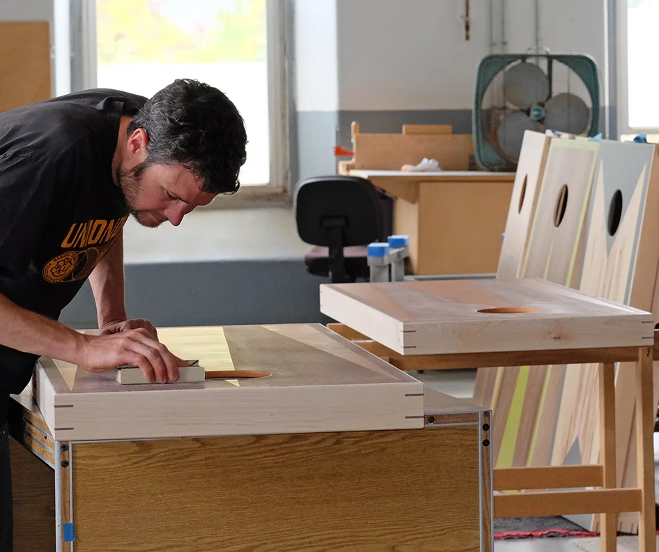 Nick Hollibaugh was born and raised in Indianapolis, Indiana. When most kids were watching cartoons, Nick spent his Saturday mornings watching episodes of the New Yankee Workshop. And so was born a life long fascination with woodworking and the art of building. His love for craft and art became more evident in high school and it became clear that this was the direction his life would go. He went on to study Art and Furniture Design at Heron School of Art in Indianapolis where he received his Bachelors Degree. He was then recruited to the Rhode Island School of Design where he continued his studies in Furniture Design and Sculpture. After receiving a Masters Degree in fine art, Nick remained in Providence and began his career as both a Woodworker and an Artist.